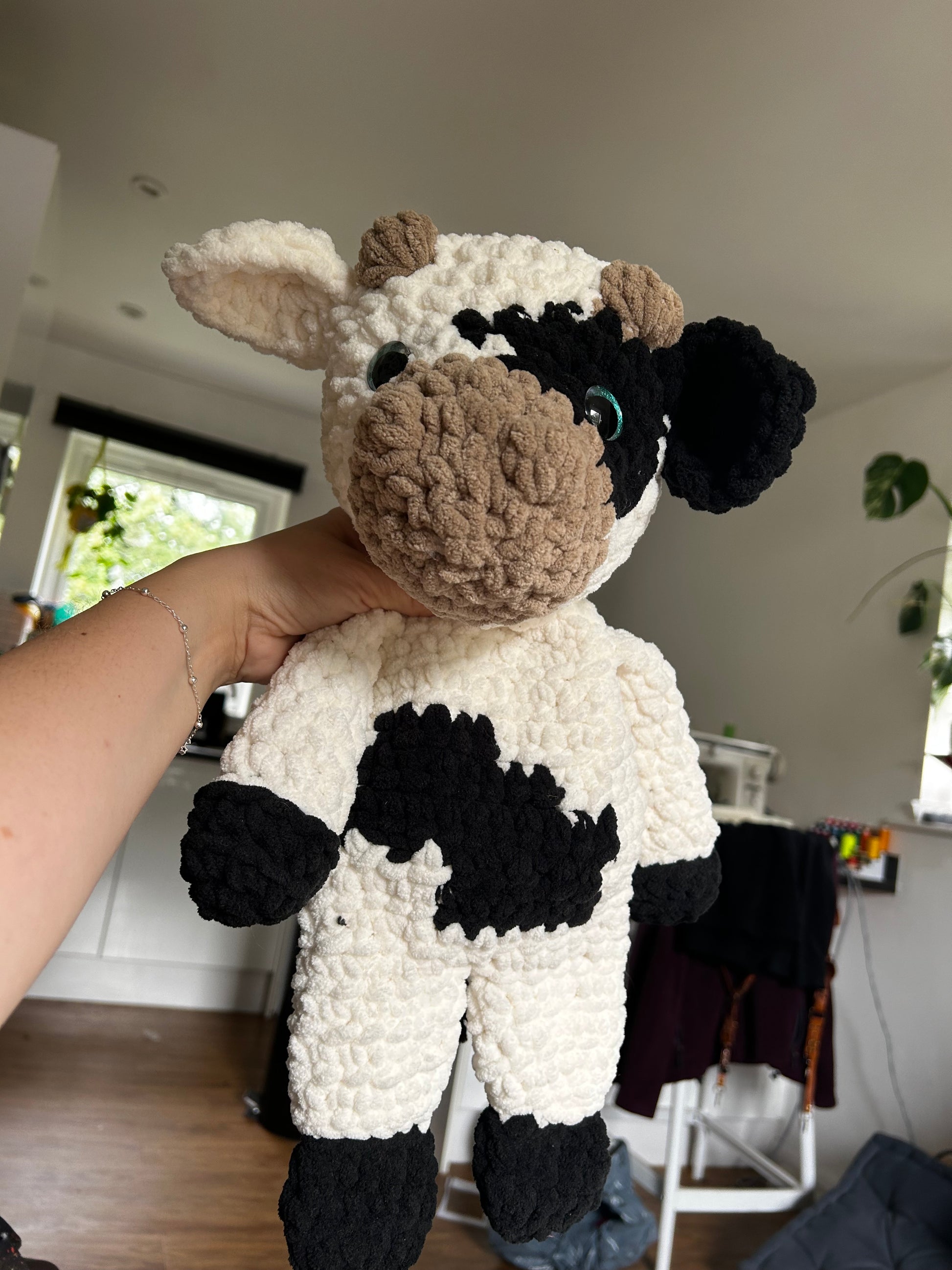- Design: A charming cow face with Safety eyes, floppy ears, and little horns that add to its cute and comforting appeal.